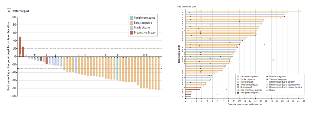 研究主要终点为客观缓解率(ORR),次要终点包括无进展生存期(PFS)、至反应时间(TTR)、反应持续时间(DOR)、疾病控制率(DCR)、总生存(OS)和安全性。